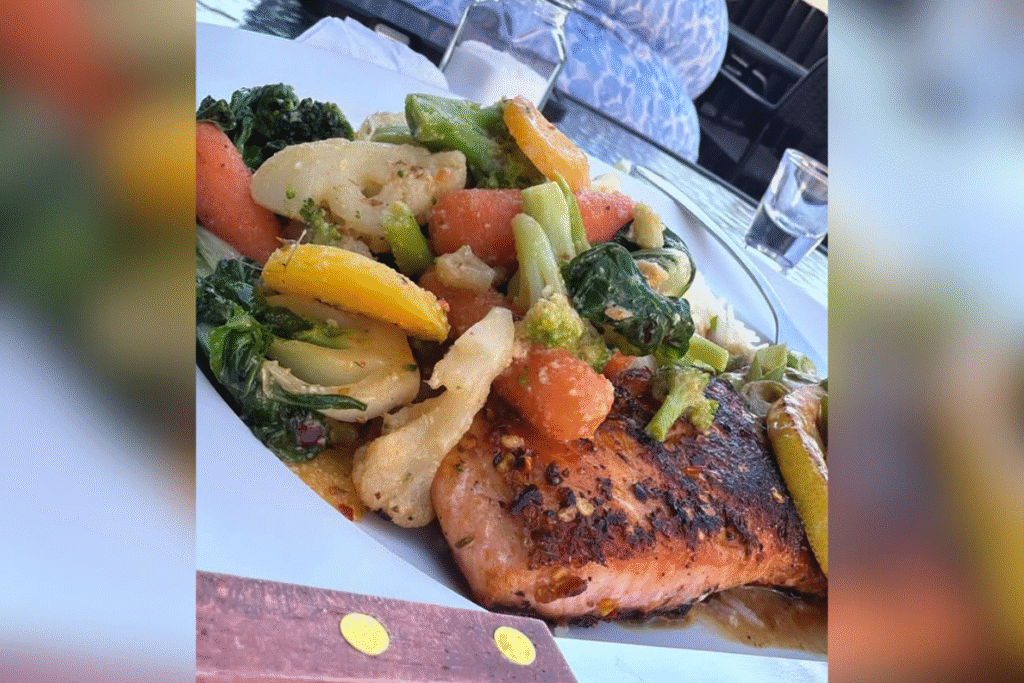 This plate hits the perfect balance between comfort and bold, smoky flavour. The salmon is seasoned with a homemade spice blend that creates a crisp outer crust while keeping the inside soft and tender. Paired with fresh vegetables and creamy mashed potatoes, it delivers a hearty yet wholesome seafood experience that feels special but still familiar.